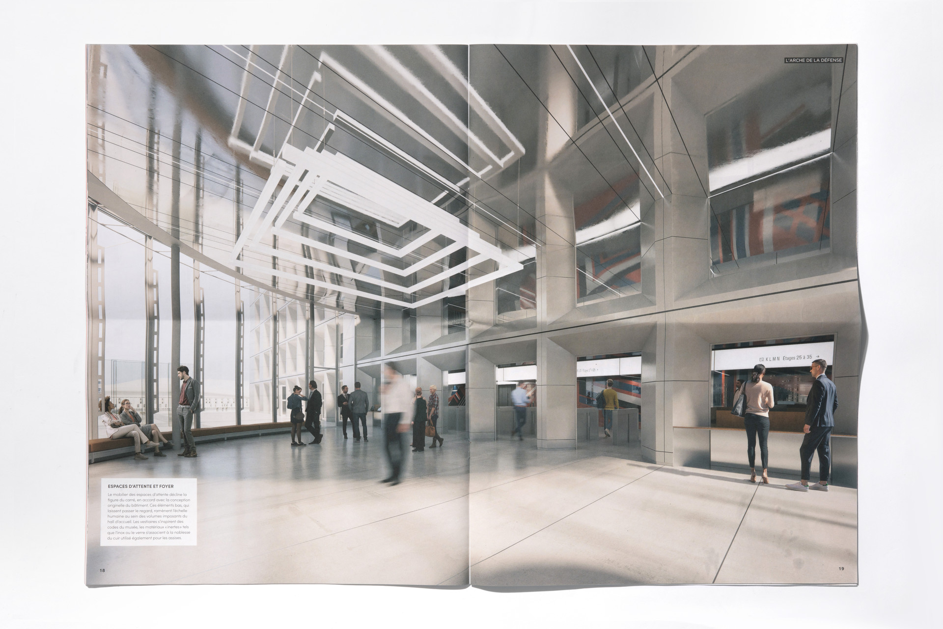 Hall de l’aile nord de la Grande Arche, la Défense ; Comptoir du restaurant ; Aile nord de la Grande Arche, la Défense, lobby, banquettes en cuir, ©Schnepp Renou