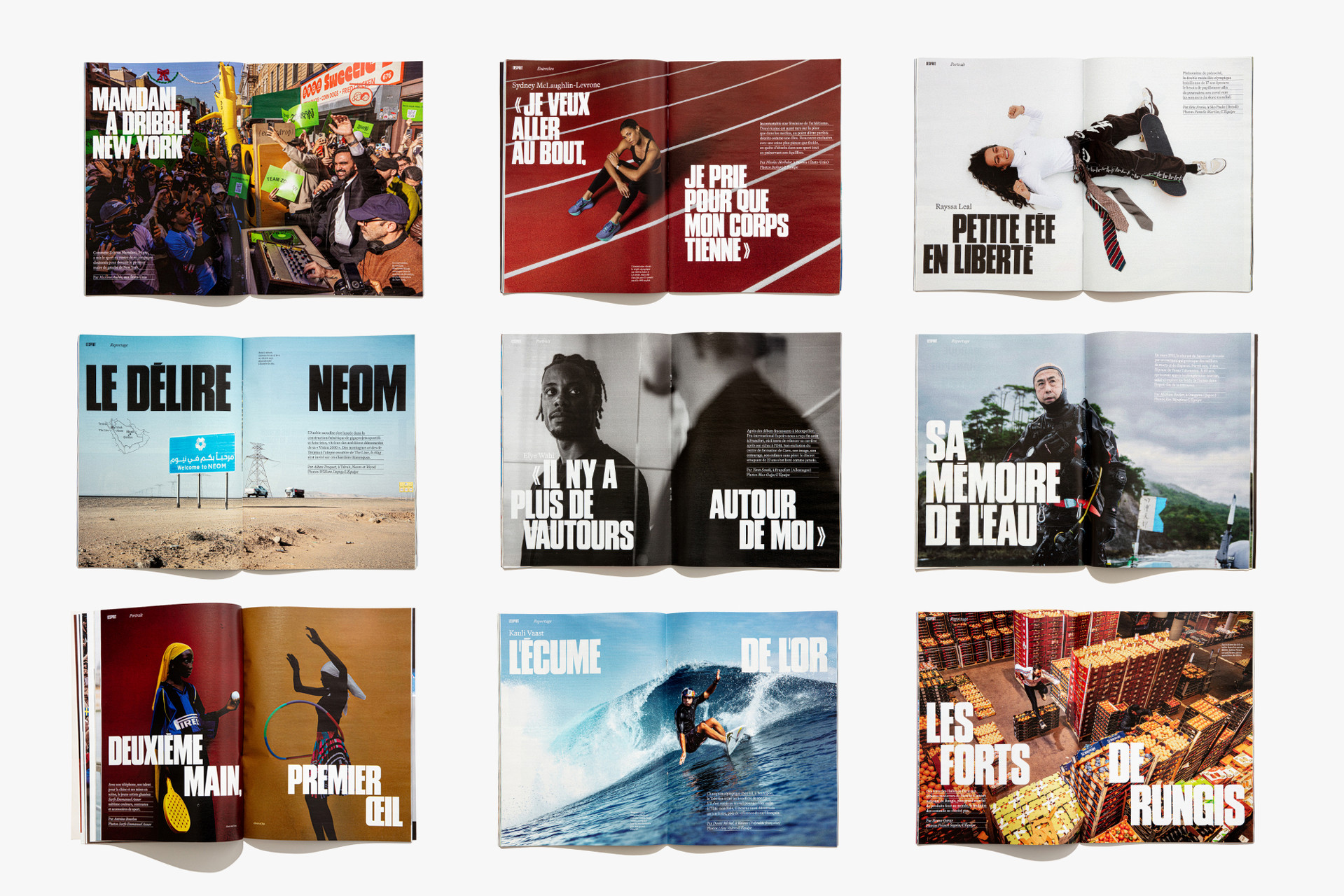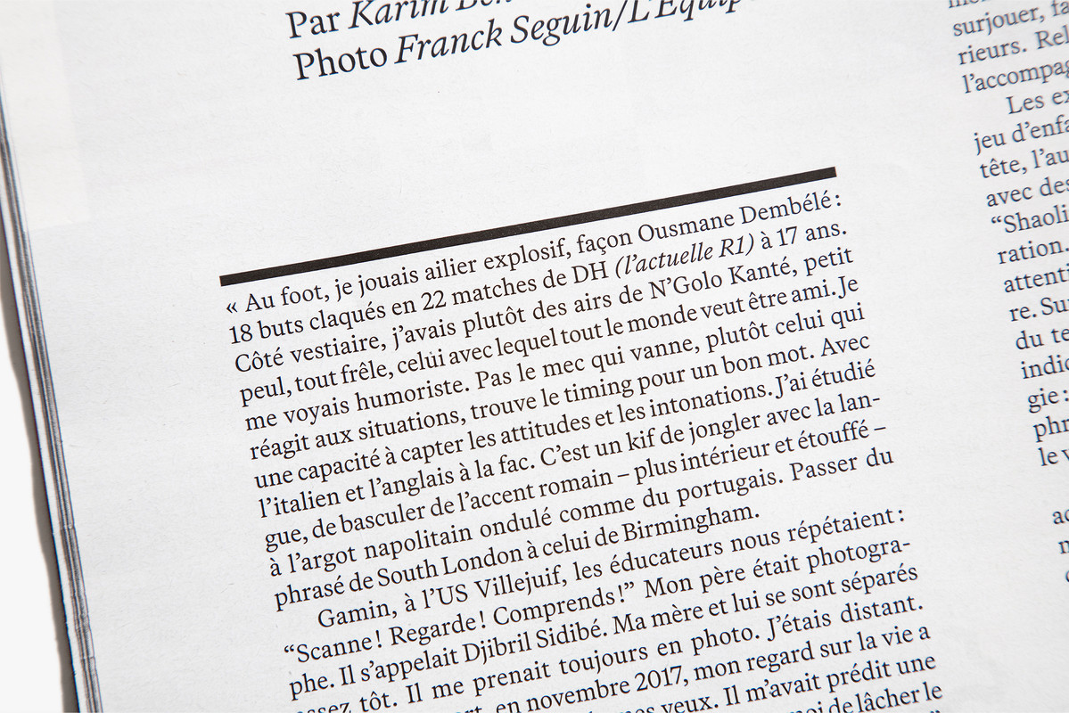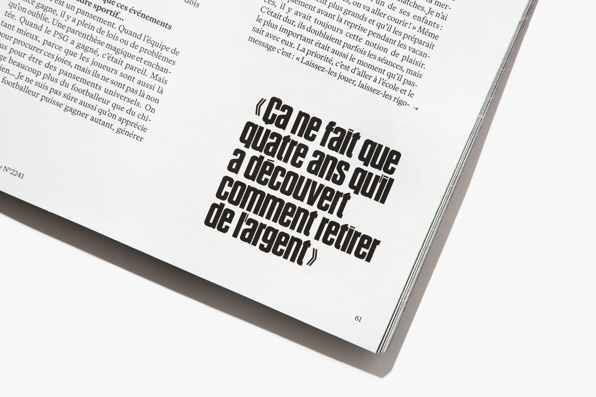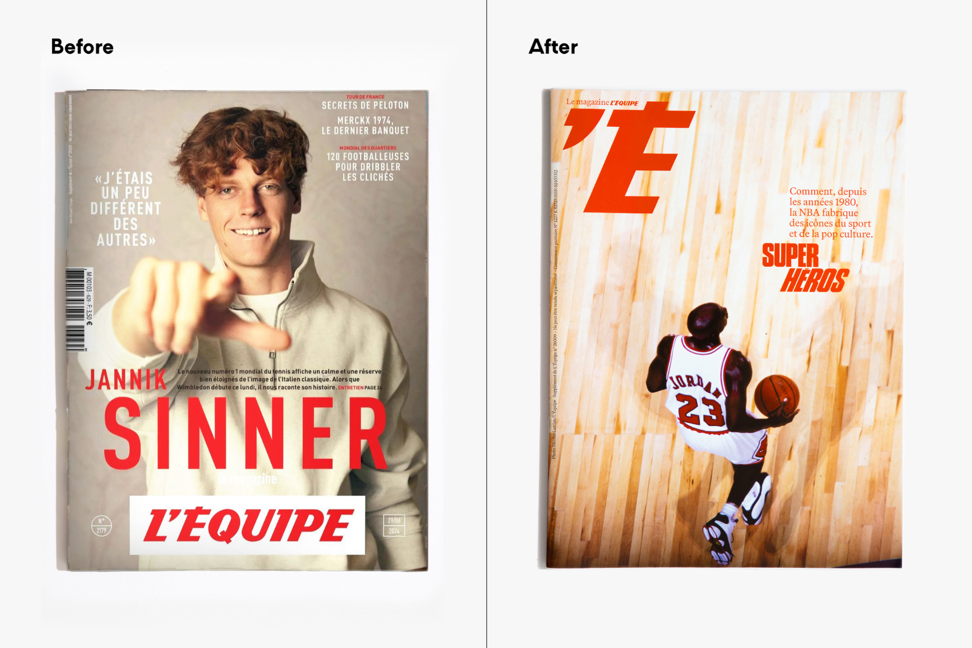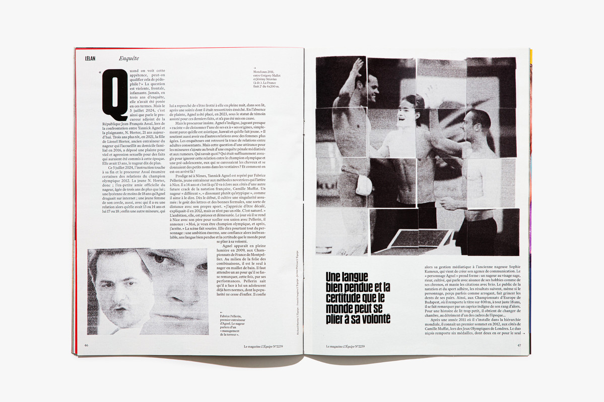 We reimagined L’Équipe Magazine, the weekly supplement of France’s leading sports newspaper, in close collaboration with the editorial team. The cover was redefined through a simple gesture: isolating the letter “É” from L’Équipe as the magazine’s logo, to singularize it and give more space to the visuals. Two complementary covers coexist: a headline-driven cover for the standalone Wednesday edition, and a more minimal Saturday cover built around a single, striking visual. Our work on the new formula started with a deep exploration of the archive, dating back to the 80s. We brought back some design elements from past issues—underlined standfirsts, paragraph-starting squares, thick lines—and combined them with a timeless layout.