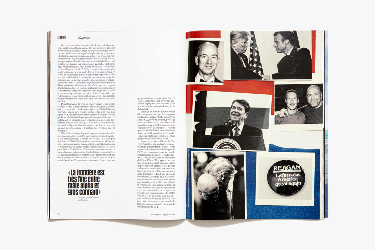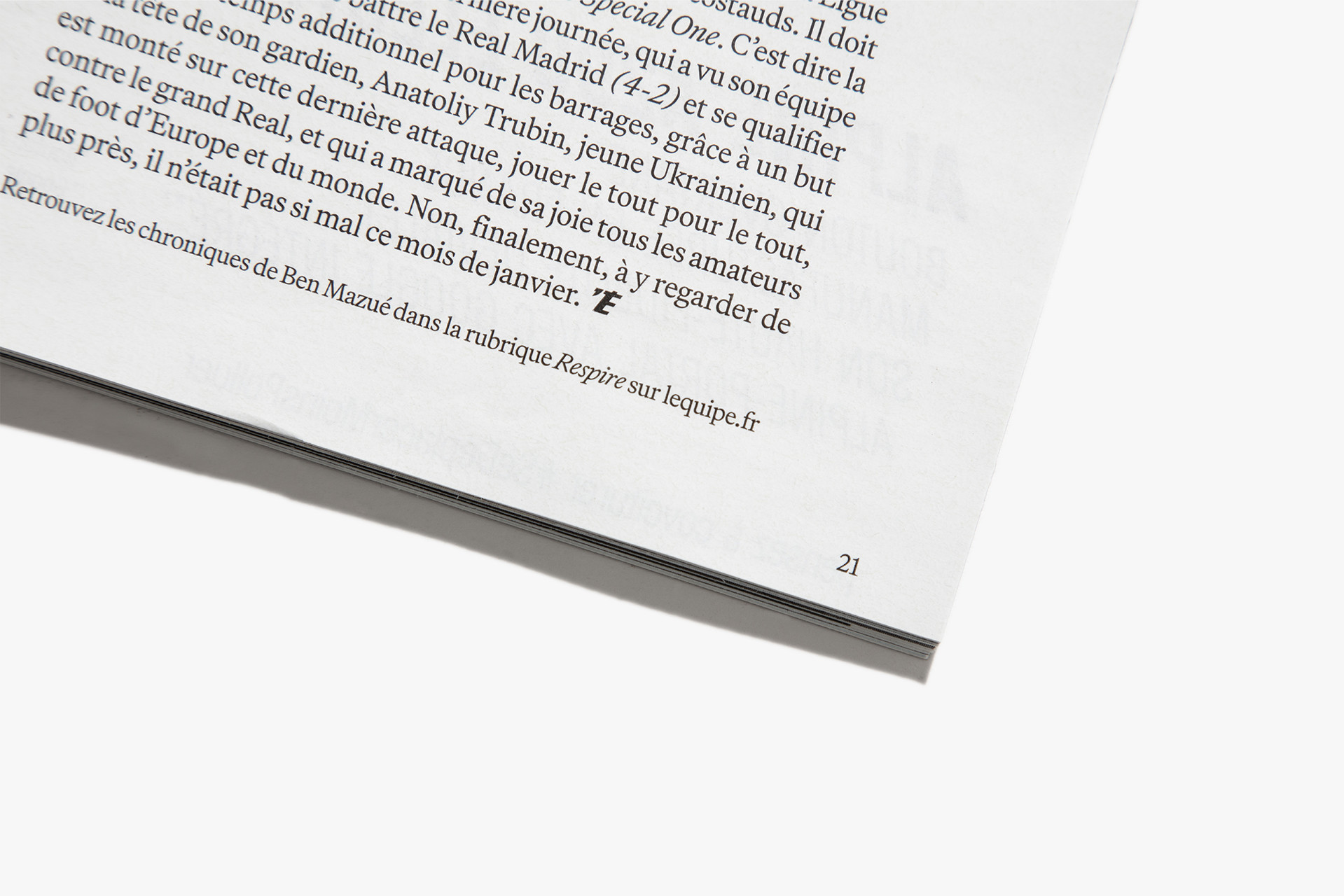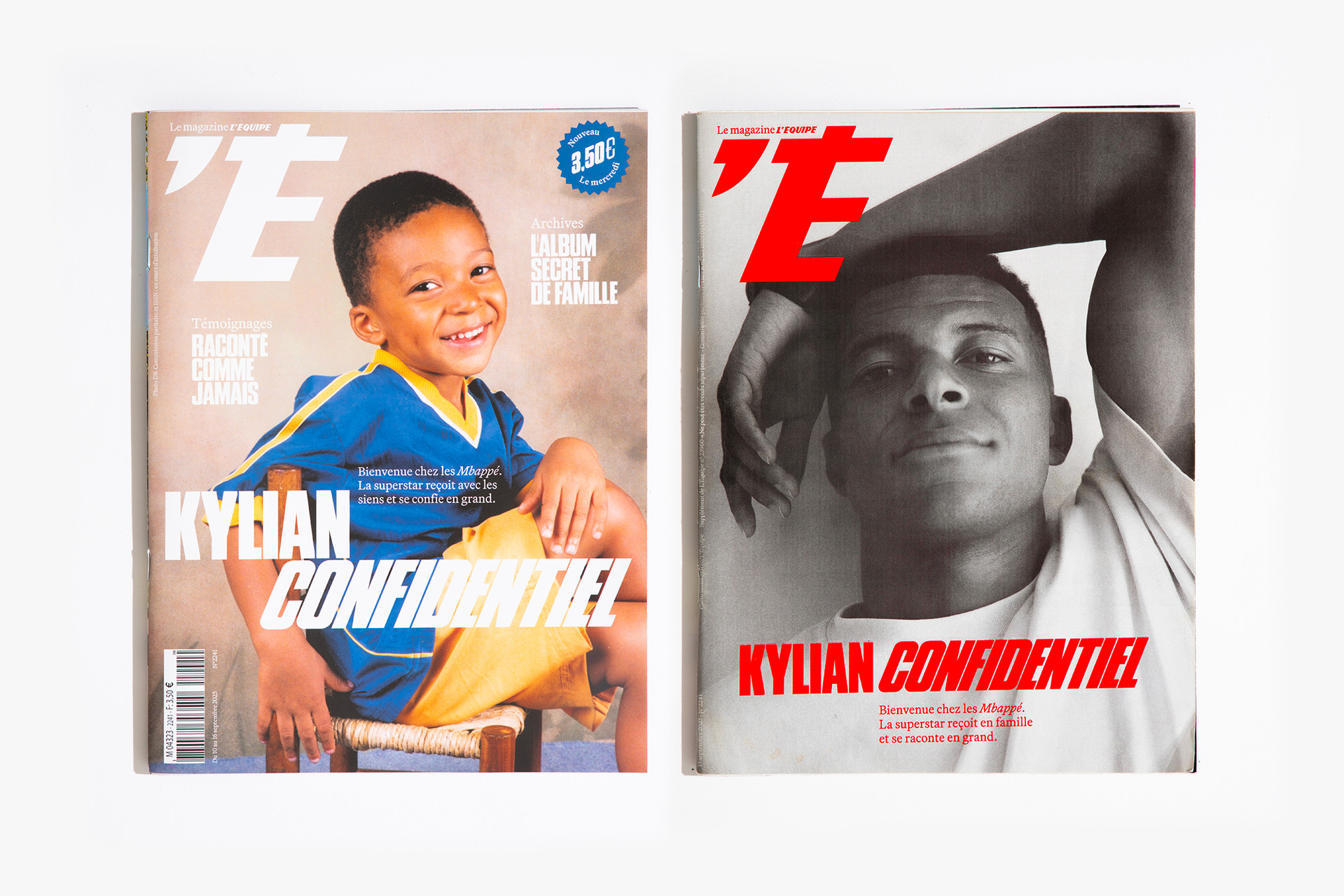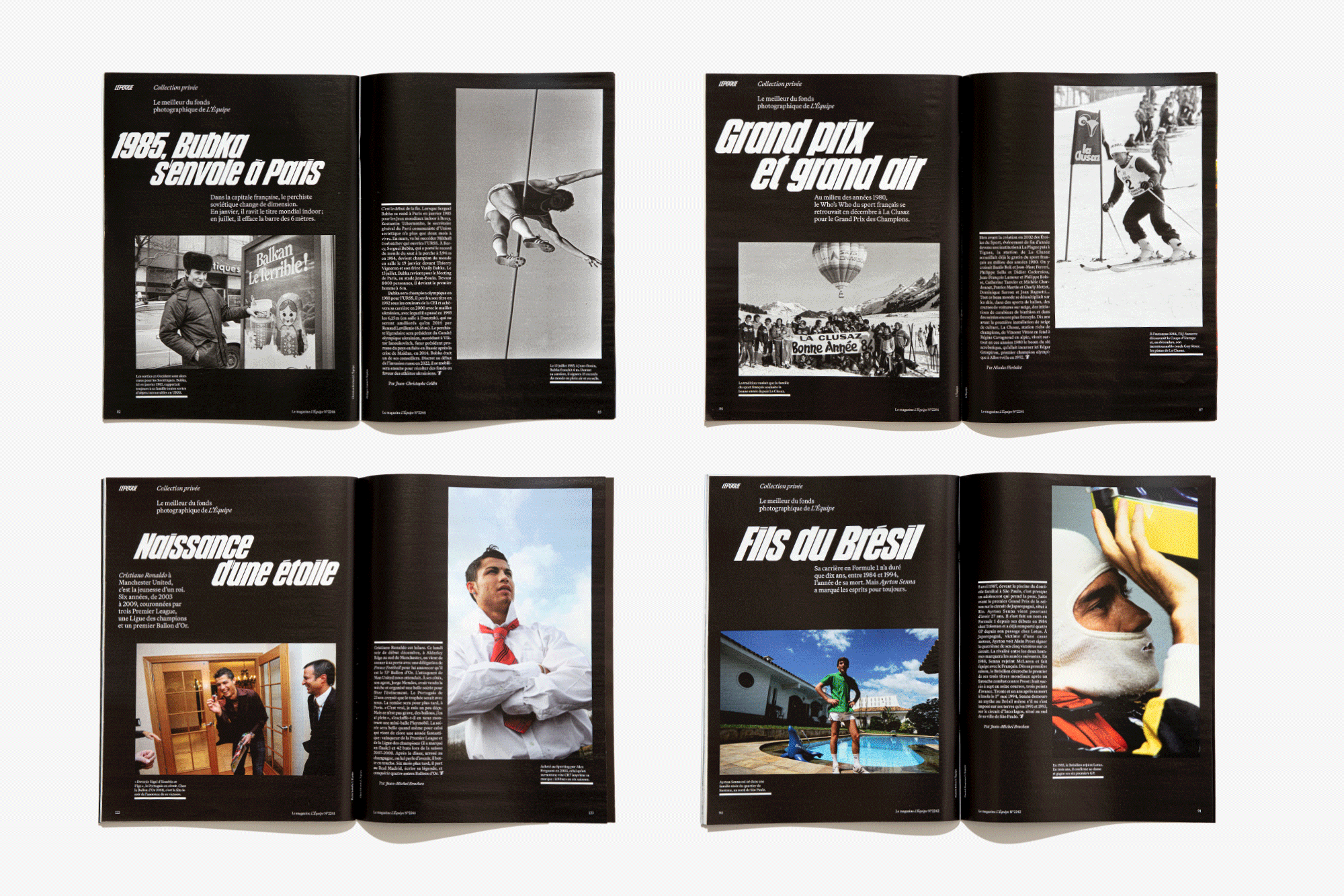 We reimagined L’Équipe Magazine, the weekly supplement of France’s leading sports newspaper, in close collaboration with the editorial team. The cover was redefined through a simple gesture: isolating the letter “É” from L’Équipe as the magazine’s logo, to singularize it and give more space to the visuals. Two complementary covers coexist: a headline-driven cover for the standalone Wednesday edition, and a more minimal Saturday cover built around a single, striking visual. Our work on the new formula started with a deep exploration of the archive, dating back to the 80s. We brought back some design elements from past issues—underlined standfirsts, paragraph-starting squares, thick lines—and combined them with a timeless layout.