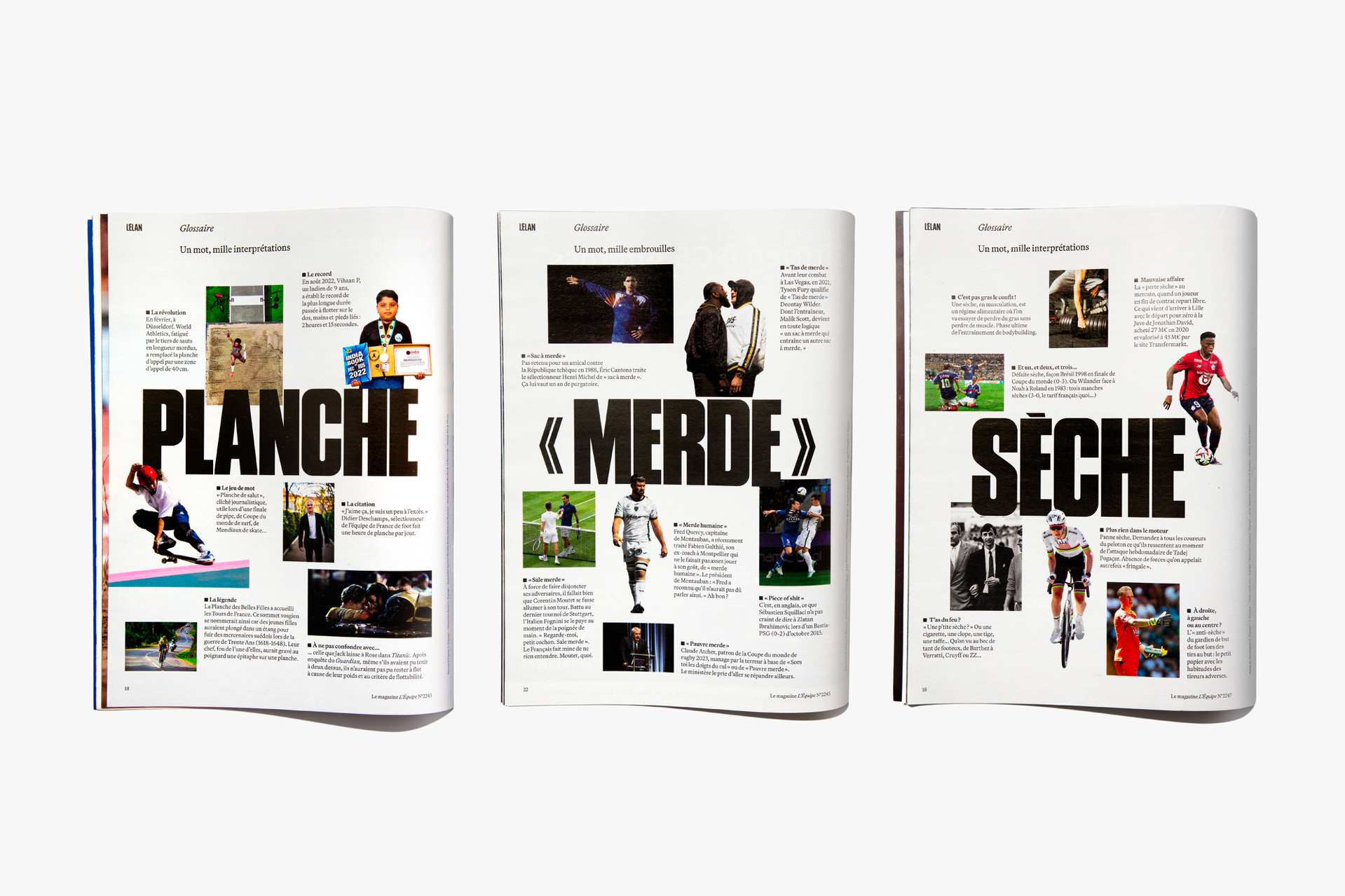 We rethought the editorial structure by creating three distinct sections, each named in resonance with the magazine: L’ÉLAN, L’ESPRIT, L’ÉPOQUE. We also proposed new recurring single-page articles, using a design-led system to create editorial rhythm and bring meaning through singular layouts. The “Glossaire” page takes a single word used across multiple sports, written in large type, and distills short answers into it. The “Generations” page compares two sports personalities side by side through a common list of milestones. The “Lieu Mythique” page looks at a legendary sports venue across decades. L’Équipe is one of the world’s most influential sports newspapers and a central institution in French sporting culture. The publication has shaped global sport, notably creating the Tour de France and the Ballon d’Or. The weekly magazine supplement was launched in 1980, and our new formula is the 13th in 45 years.