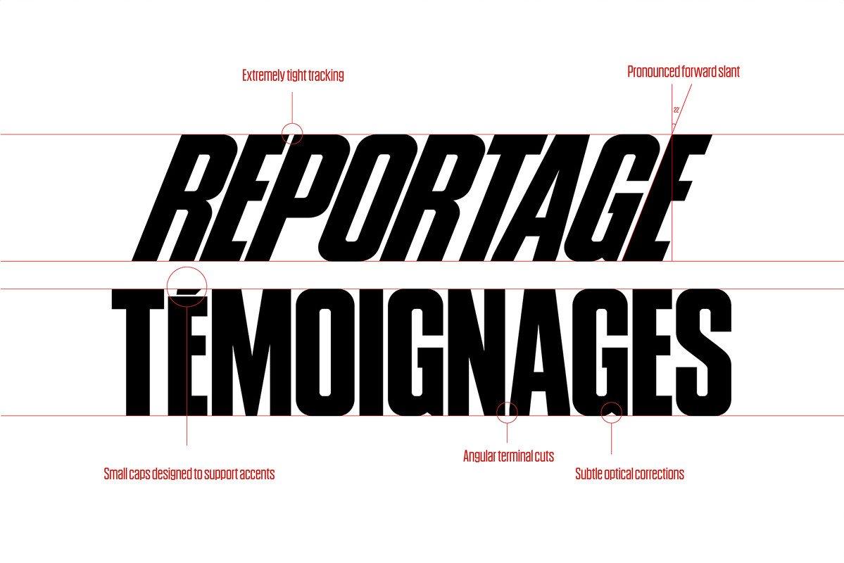 Gradin, the custom font we designed for the project, is a sans-serif headline typeface developed for tight compositions. It combines a compact width, minimal spacing, and square counters to produce dense and impactful headlines. Inspired by Compacta, historically used for the magazine’s identity, it offers a contemporary reinterpretation with a more monolinear construction. The family includes eight weights from Light to Black with italics, including a 22.5-degree italic based on the dynamic slant of the 1946 L’Équipe logo.
