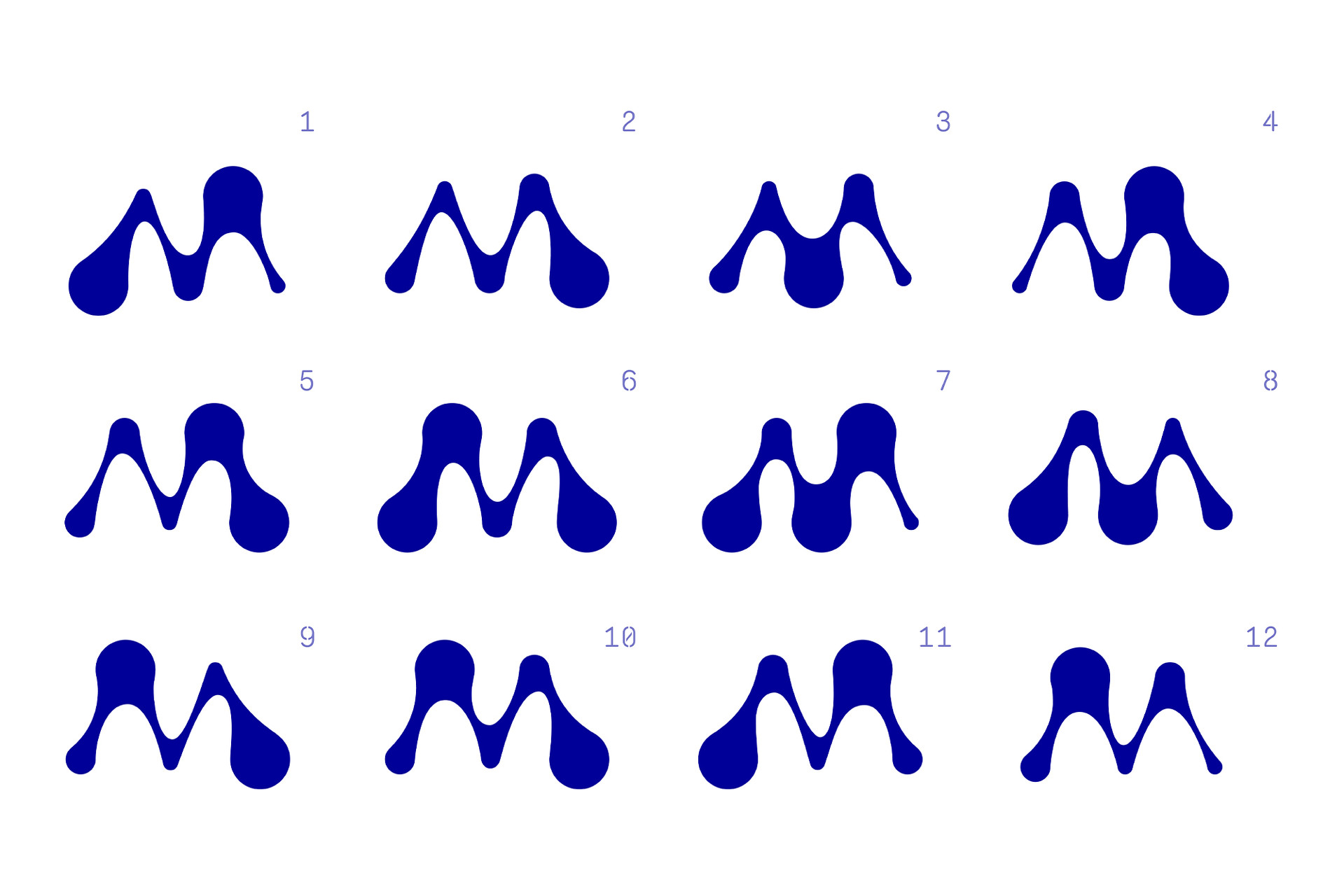 Our flexible icon system utilises twelve versions of an uppercase ‘M’ including all the variants in between for the symbol’s digital animations. The brand identity pairs a palette of electric blue and off-white, anchored by Monosten, a monospace typeface from Colophon, to establish scientific precision.