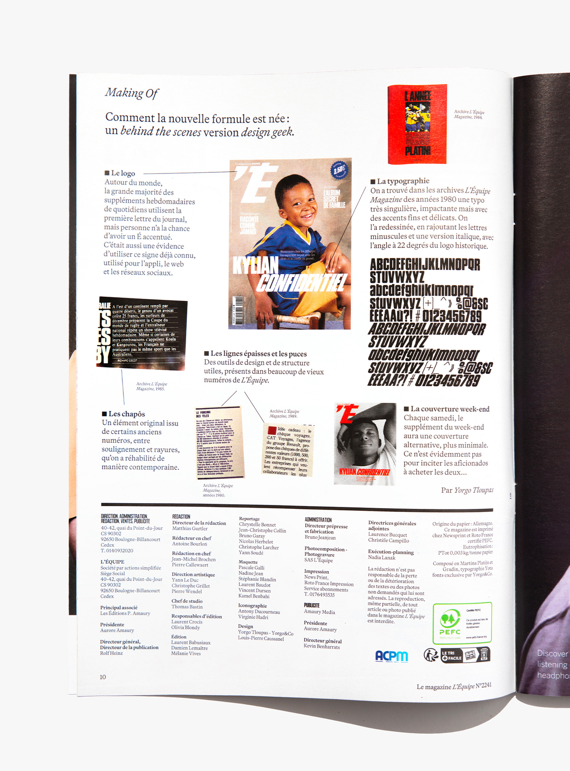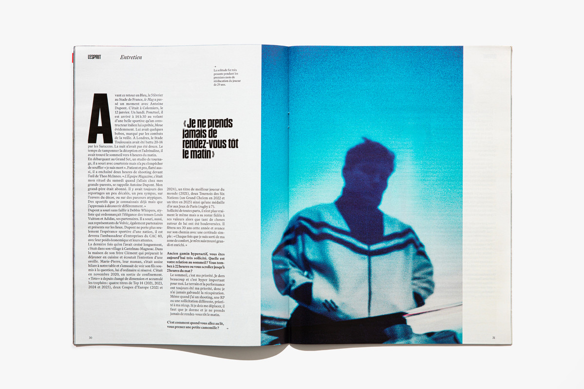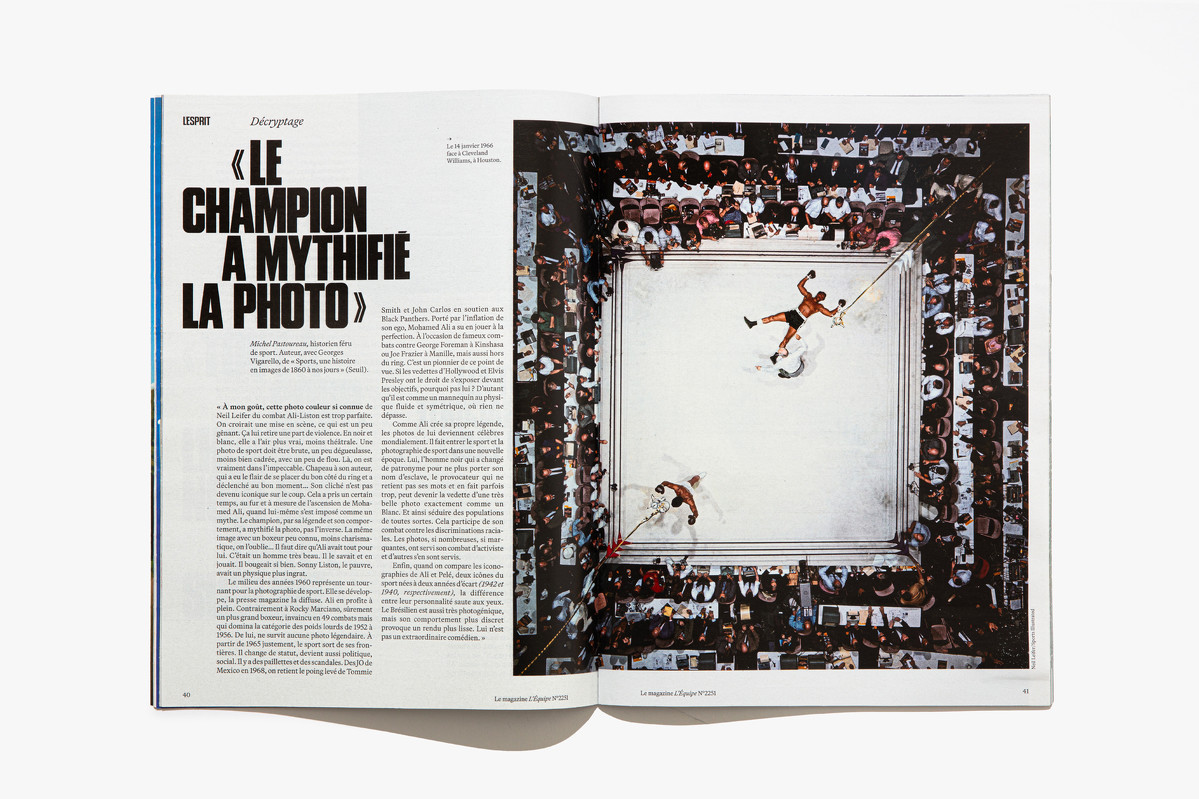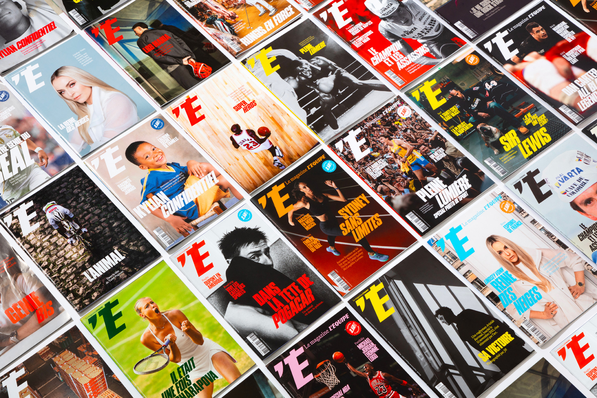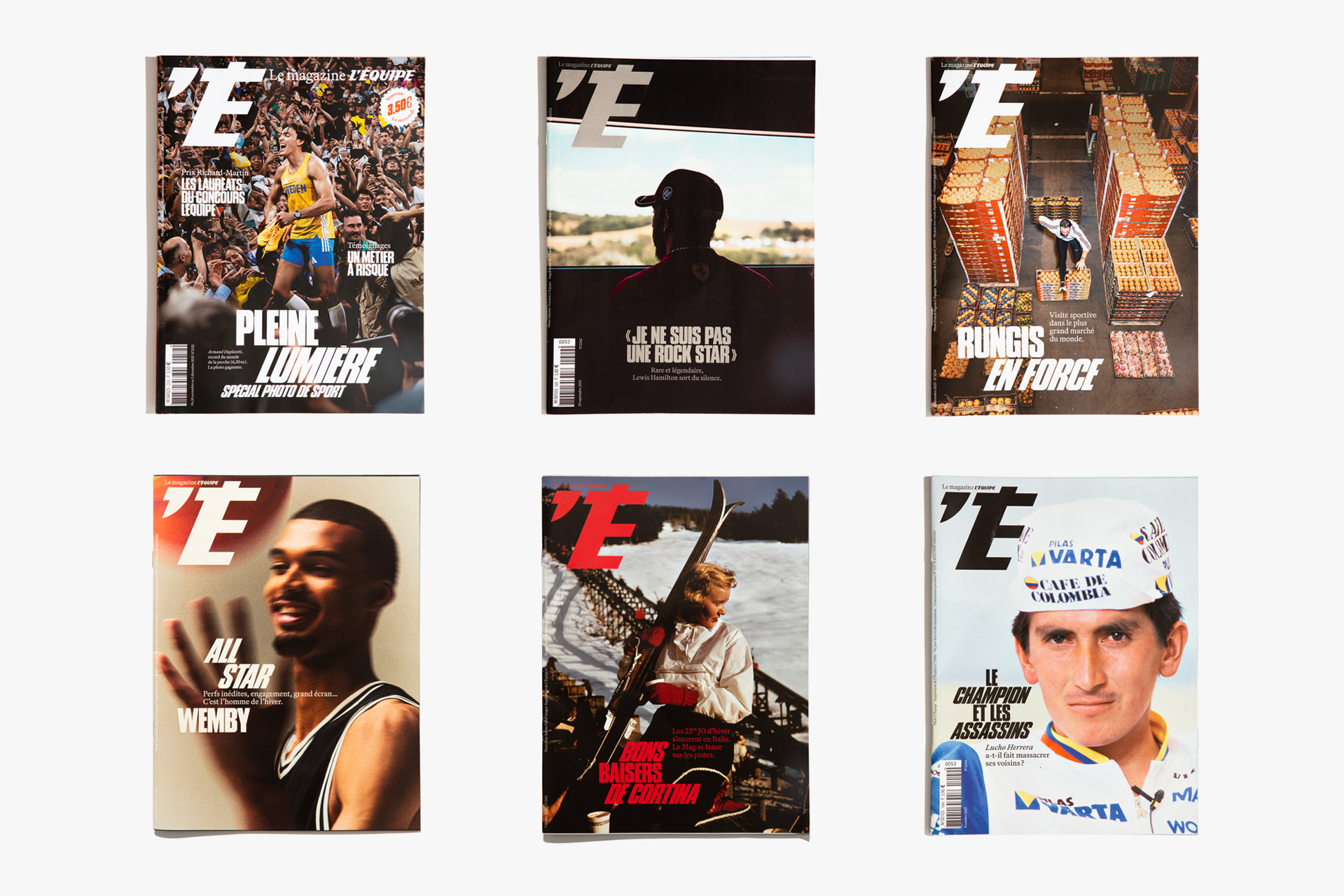 We reimagined L’Équipe Magazine, the weekly supplement of France’s leading sports newspaper, in close collaboration with the editorial team. The cover was redefined through a simple gesture: isolating the letter “É” from L’Équipe as the magazine’s logo, to singularize it and give more space to the visuals. Two complementary covers coexist: a headline-driven cover for the standalone Wednesday edition, and a more minimal Saturday cover built around a single, striking visual. Our work on the new formula started with a deep exploration of the archive, dating back to the 80s. We brought back some design elements from past issues—underlined standfirsts, paragraph-starting squares, thick lines—and combined them with a timeless layout.