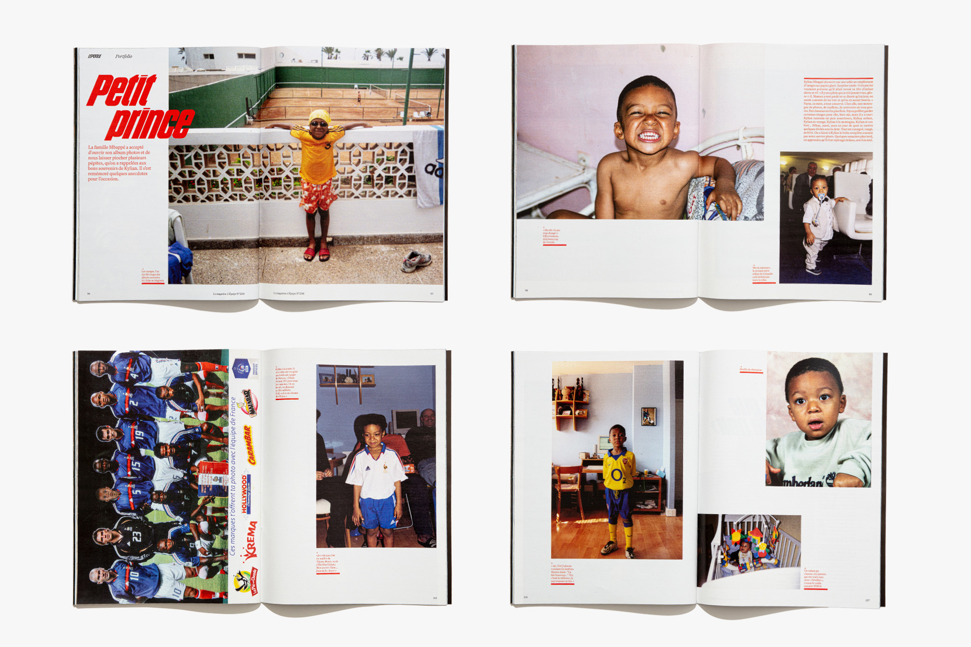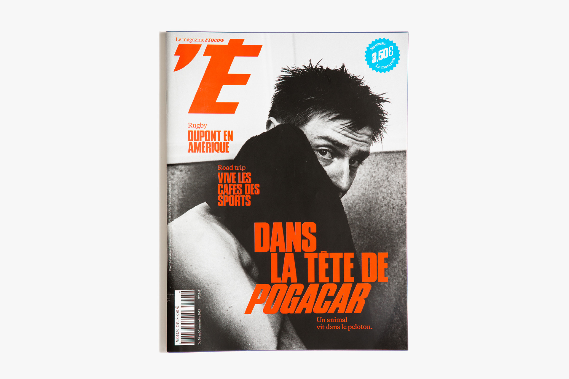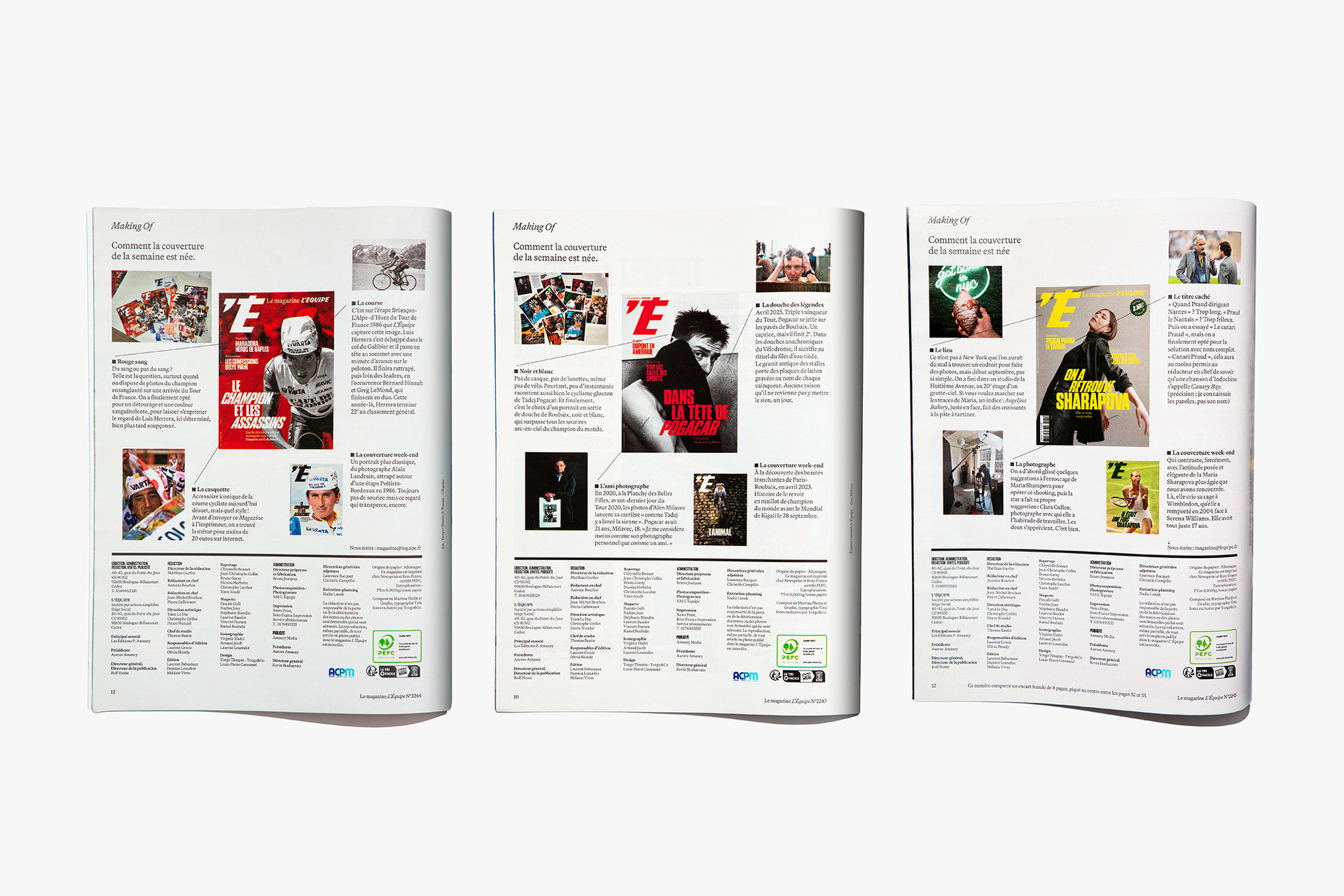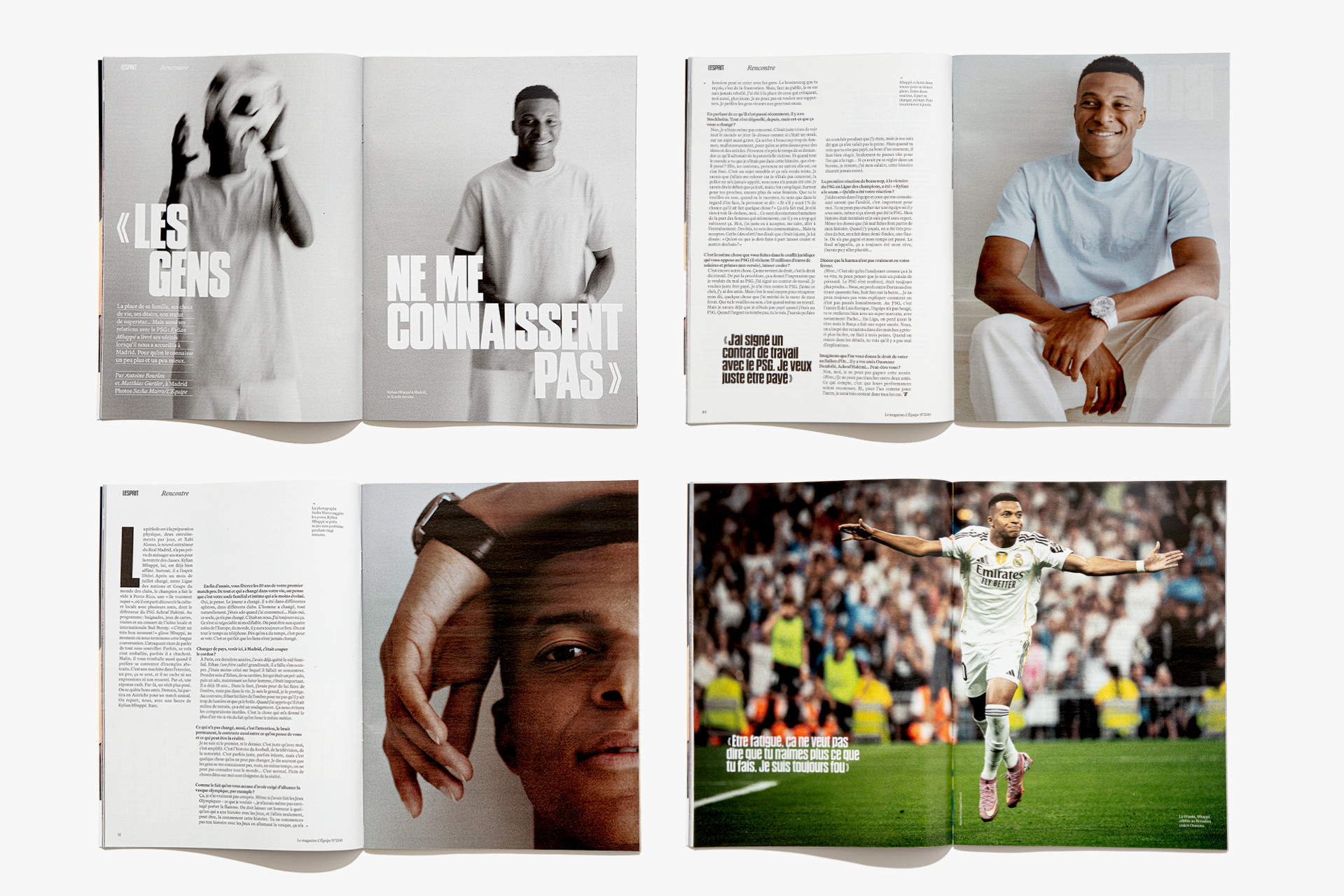 We reimagined L’Équipe Magazine, the weekly supplement of France’s leading sports newspaper, in close collaboration with the editorial team. The cover was redefined through a simple gesture: isolating the letter “É” from L’Équipe as the magazine’s logo, to singularize it and give more space to the visuals. Two complementary covers coexist: a headline-driven cover for the standalone Wednesday edition, and a more minimal Saturday cover built around a single, striking visual. Our work on the new formula started with a deep exploration of the archive, dating back to the 80s. We brought back some design elements from past issues—underlined standfirsts, paragraph-starting squares, thick lines—and combined them with a timeless layout.